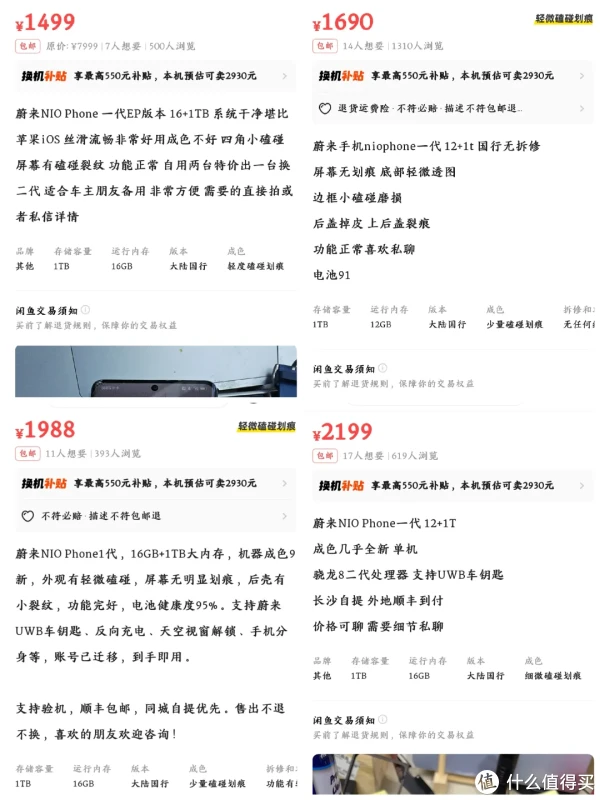 价格方面。这款手机虽然价格高昂,但高贵的蔚来车主都是能够买的起的。目前蔚来一代手机在闲鱼上最低价格1500元左右,不过成色可能会有点差,成色好的1800元左右,1TB内存版2000元左右可以拿下。如果你不是蔚来车主,你会考虑吗?
