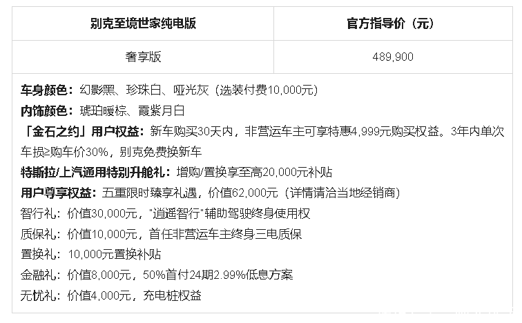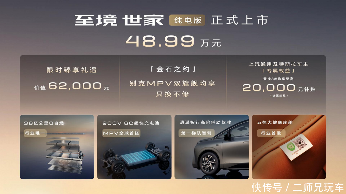 2026年3月17日 今天,别克品牌宣布:旗下首款纯电MPV——至境世家纯电版上市,推出纯电奢享版一款车型,官方指导价48.99万元。至境世家纯电版延续“别墅级新能源旗舰MPV“定位,完整继承插混版车型的硬核实力,更以900V 6C超快充电池、“哑光灰”双拼色高定涂装、“金石之约”用户权益、特斯拉车主专属增换购礼遇等多项行业首发科技与权益,实现纯电出行体验的全面跃升。